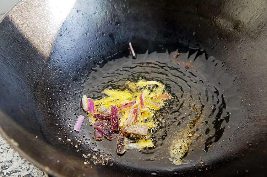 3、炒锅加入适量的油,爆香五香粉和少许毛葱,可以直接爆香大蒜,不用毛葱;