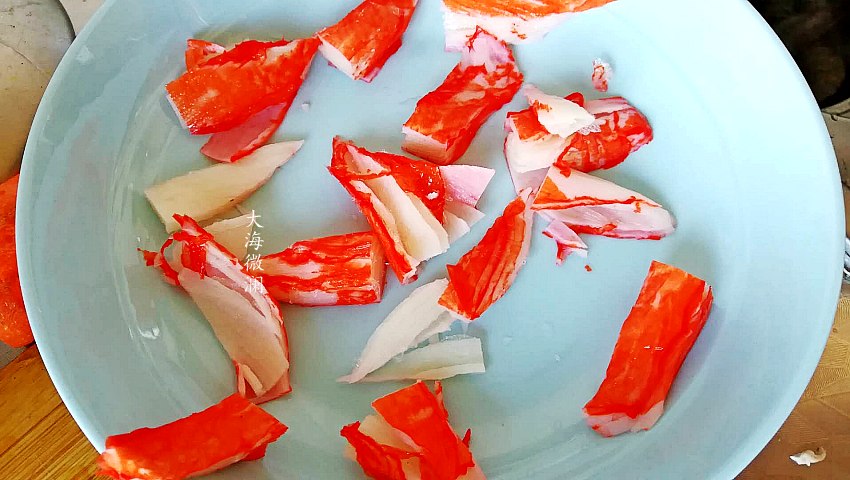 3、蟹柳去掉包装,清洗干净,根据自己喜欢的大小切成快,摆放在碗中;