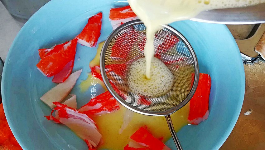 【蟹柳蒸水蛋】所需食材:鸡蛋3个;蟹柳适量;盐适量;海鲜酱油适量;凉开水适量。