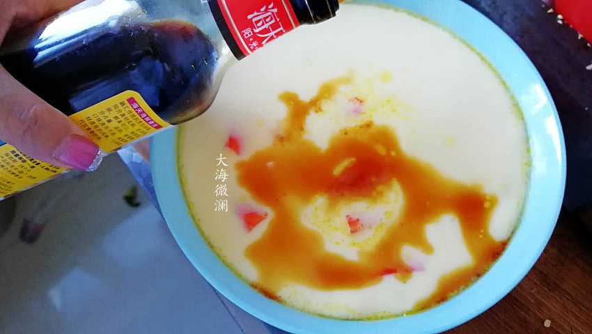 6、出锅,取下保鲜膜,倒入适量的海鲜酱油,特别有味道,孩子们都爱吃;