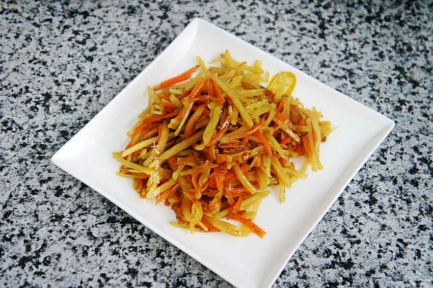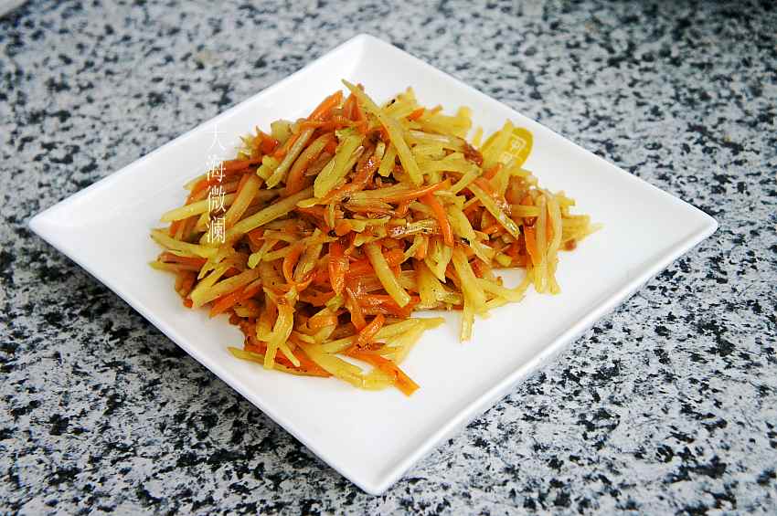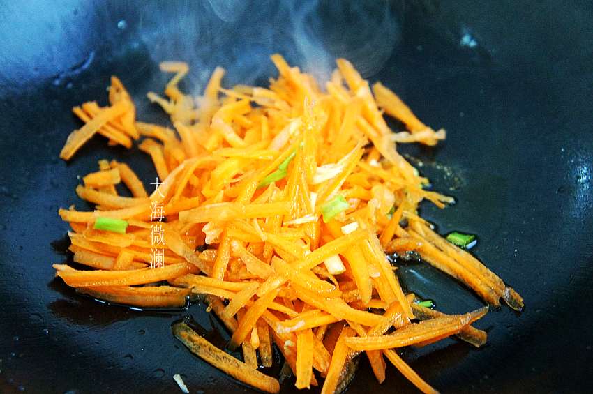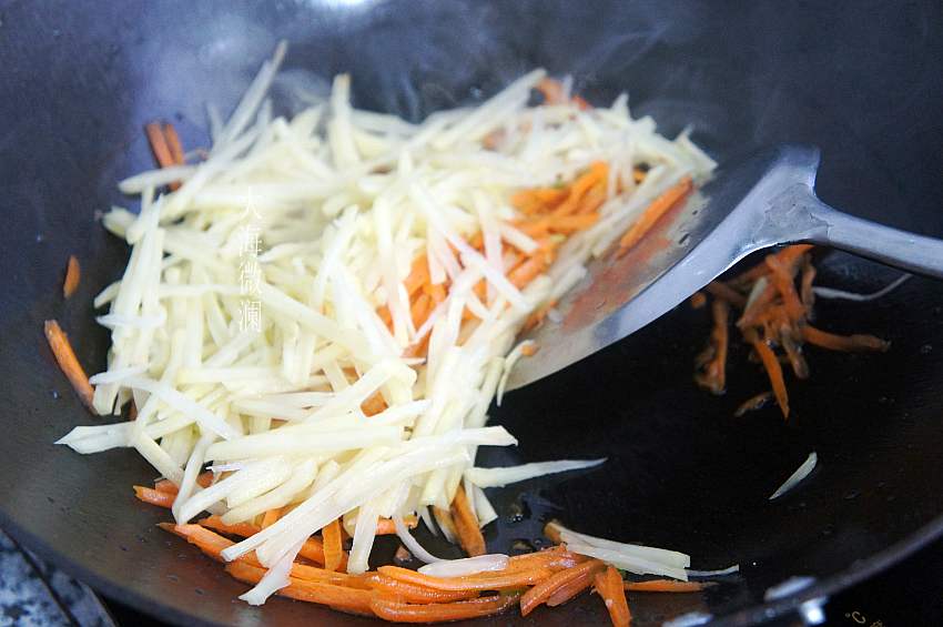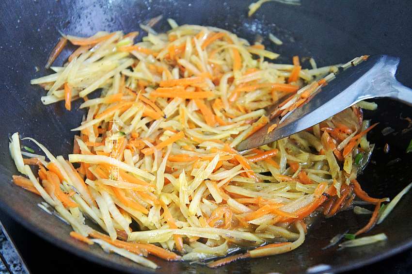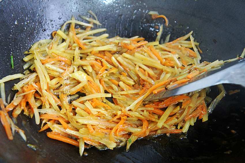 5、土豆丝、胡萝卜丝炒熟,注意不要炒碎;