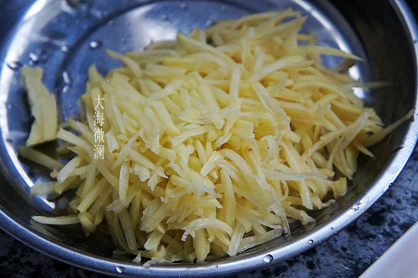 做法:1、取一个土豆去皮洗净,用擦丝器擦成丝,也可以切成土豆丝,加入适量的水,浸泡10分钟左右,泡出淀粉,捞出控净水分;