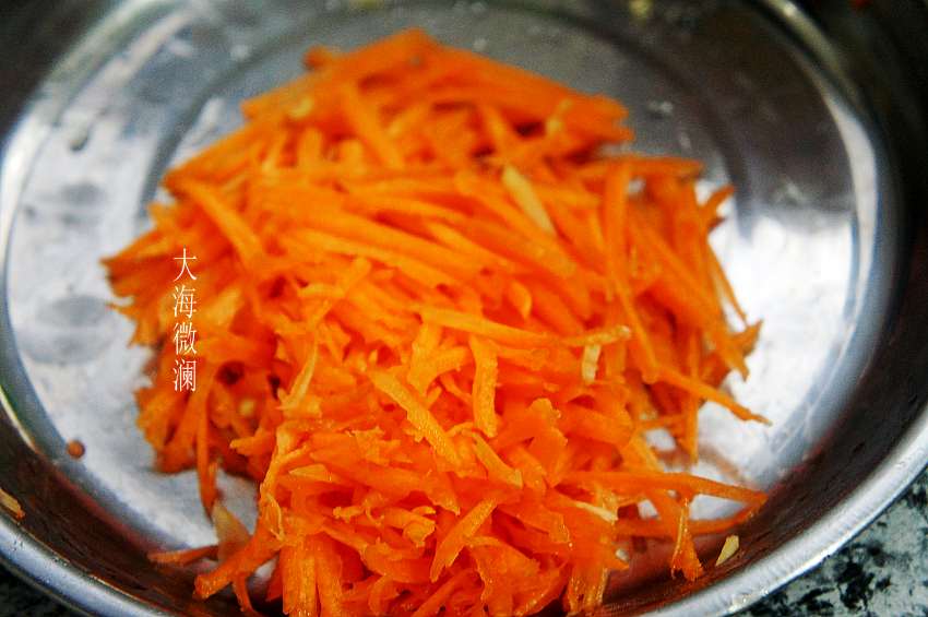 2、胡萝卜去皮洗净,同样的方法用擦丝器擦成丝备用,葱切碎,蒜切末;