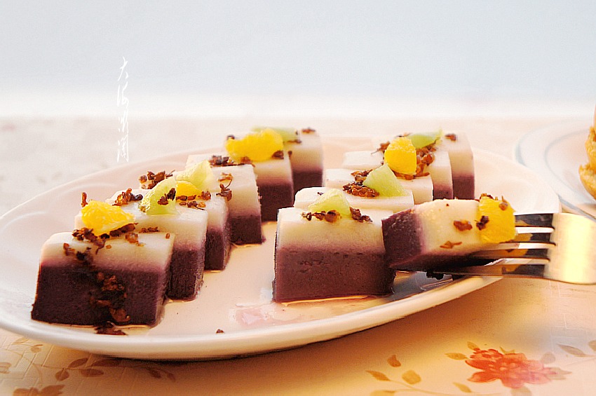 【山药紫薯桂花糕】所需食材:紫薯250g;山药150g;桂花糖适量;糖浆汁适量;椰奶100g;牛奶150g;红糖30g;白糖20g;鱼胶片2.5g。