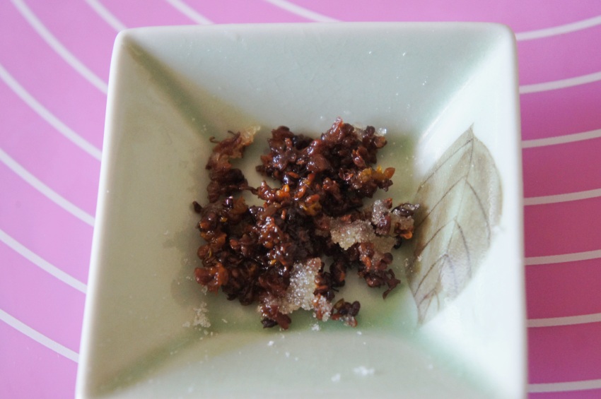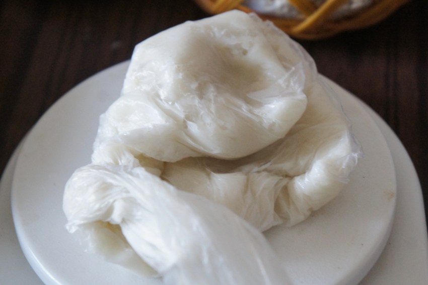 2、同样的方法将温热的山药装在食品袋内,用擀面杖擀碎成泥,过筛后搬入白糖;
