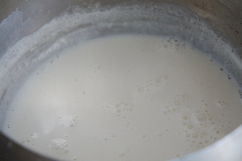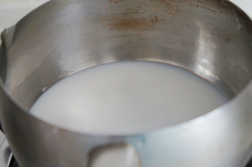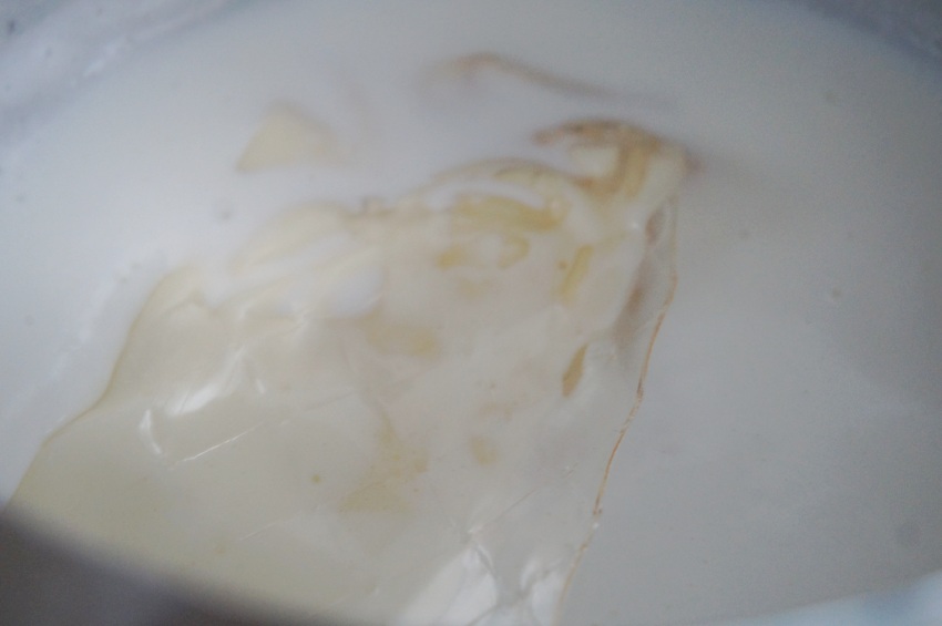 3、奶锅加入150g牛奶烧开,加入1.5片鱼胶片,轻轻搅拌;