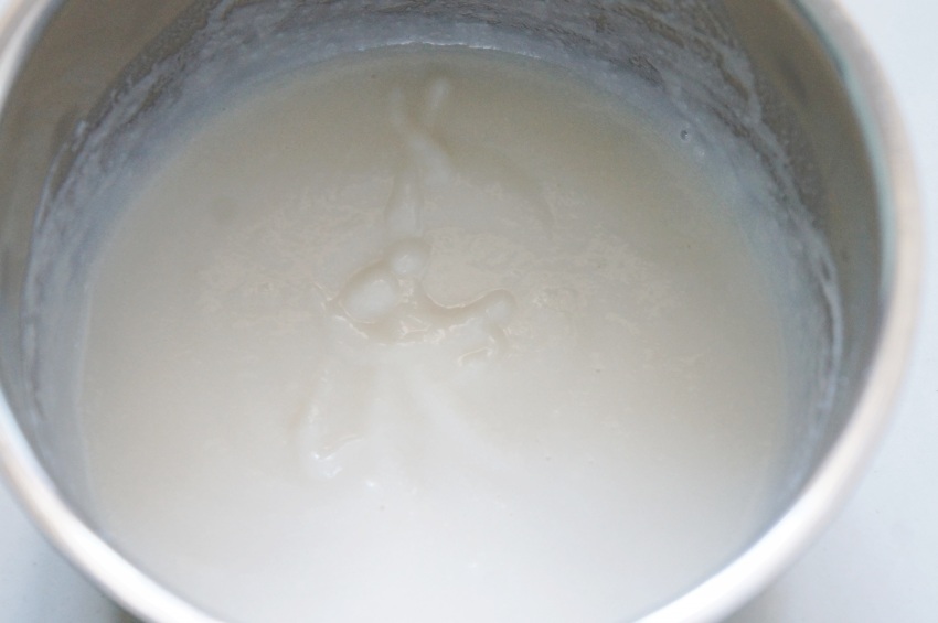 7、用同样方法熬制100g椰汁加1片鱼胶片至完全融化;