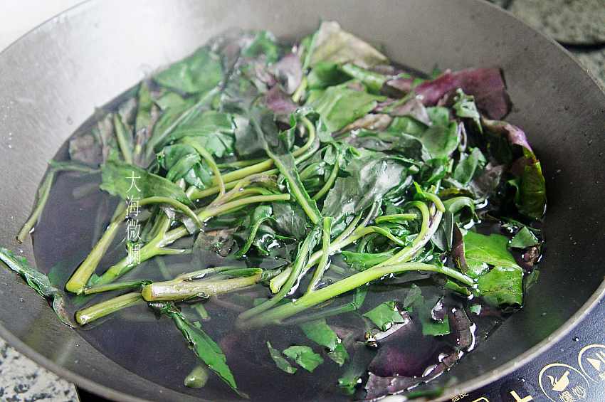 2、锅中加入适量的水,水开焯烫红苋菜,捞出过冷水,攥掉水分备用;