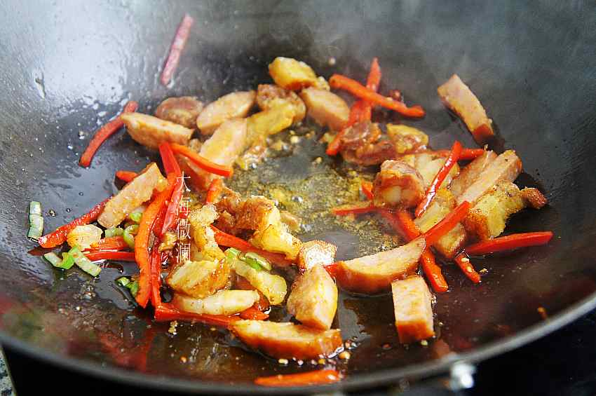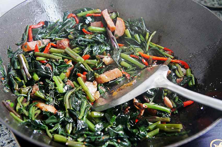 5、炒锅加入适量的油,爆香五香粉和葱花,加入猪肉和香肠,少许红椒丝翻炒,炒至猪肉出油;6、加入焯烫过的红苋菜翻炒;