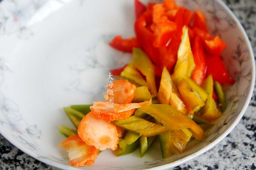 2、清、红椒洗净,切小块,不要太多,块也要小一点;