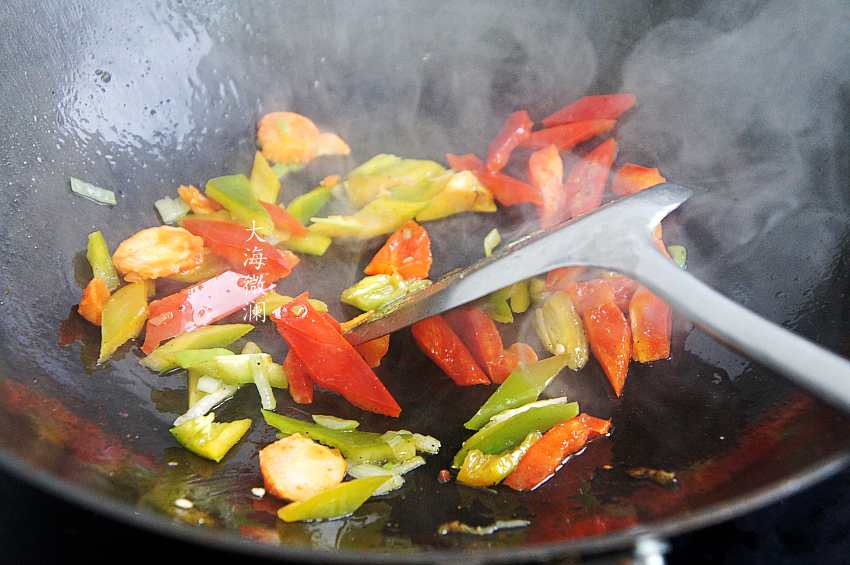 3、炒锅加入适量的油,爆香葱蒜末,下入青、红椒翻炒;