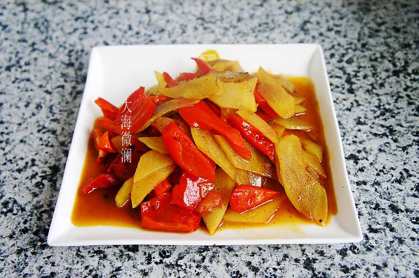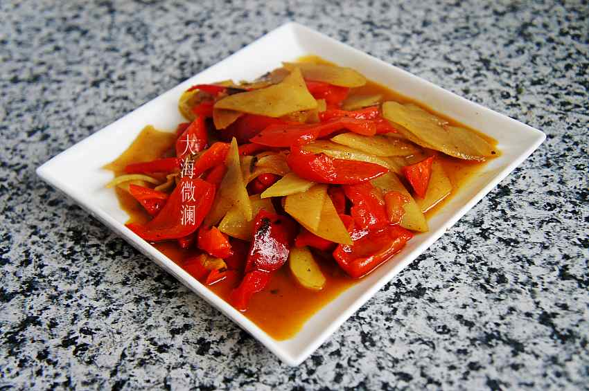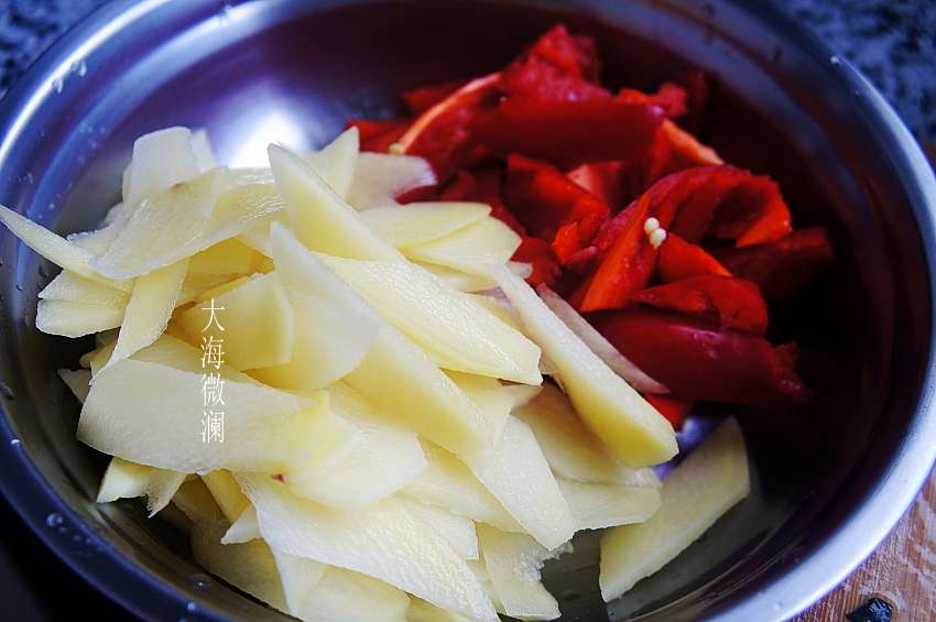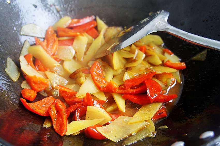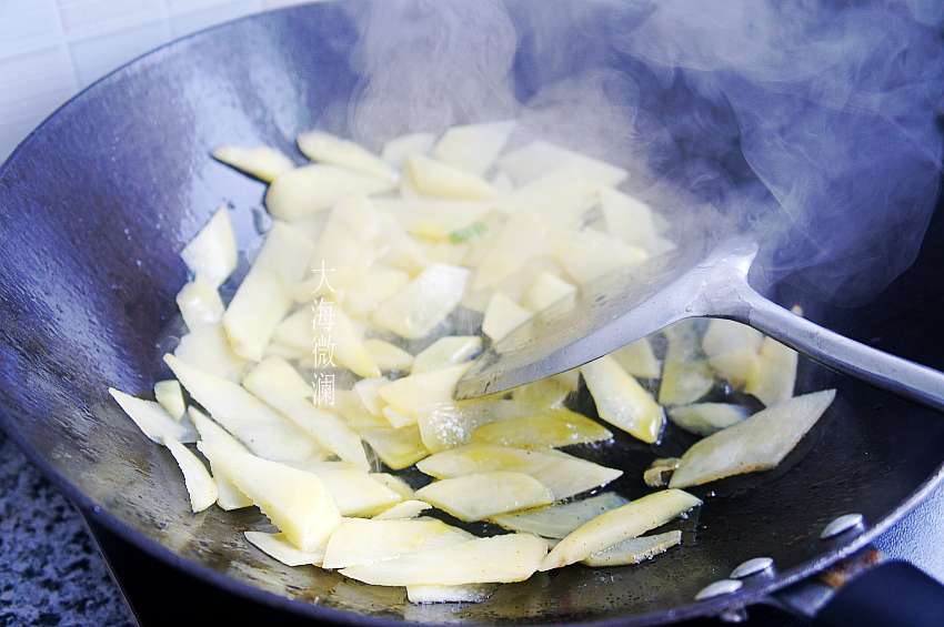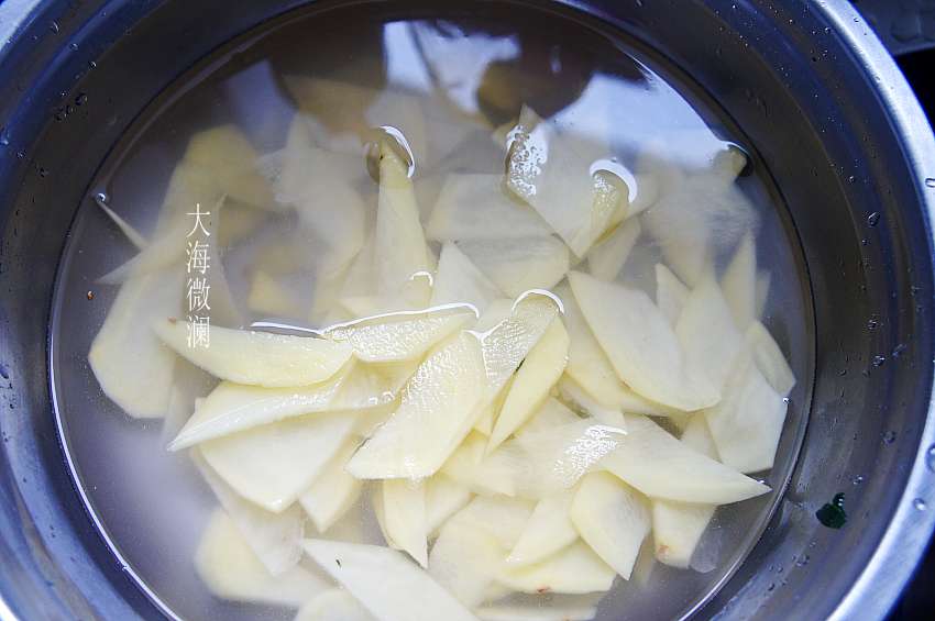 土豆片冷水浸泡出淀粉,炒后脆嫩爽口,出锅前少许加入浸泡土豆片的水,煮上1分钟,既有芡汁的作用,土豆还爽口而不黏糯。