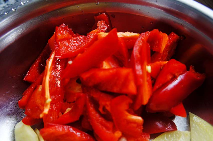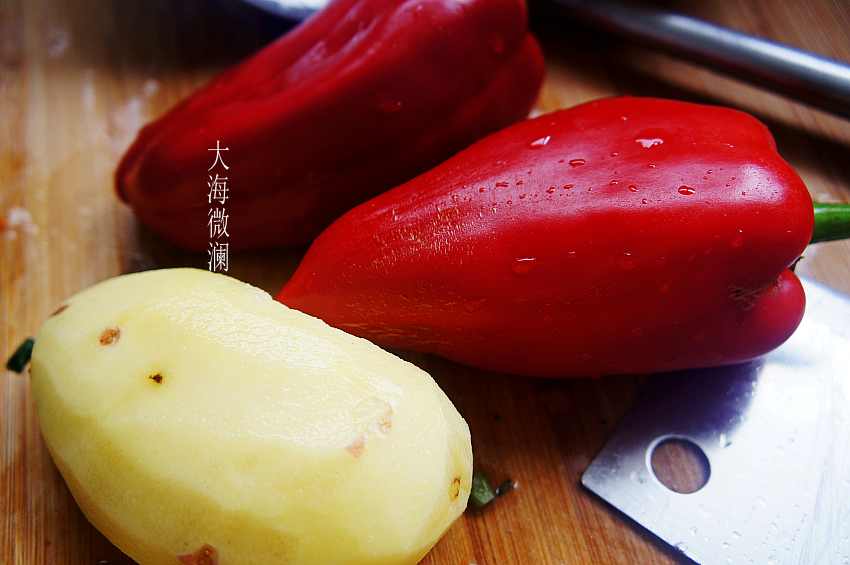 做法:1、准备食材,红椒洗净,土豆去皮洗净备用;