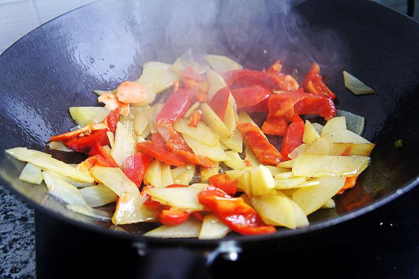 6、加入少许浸泡土豆片的水,让土豆、青椒熟透,略有芡汁的作用,然后加入盐、生抽调味;