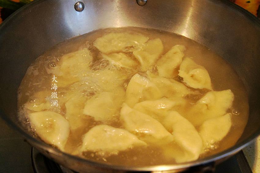 3、煮饺子,水开后饺子入锅,第一次翻开后点入冷水,第二次翻开再次点入冷水,第三次翻开即可出锅,饺子煮的恰到好处。