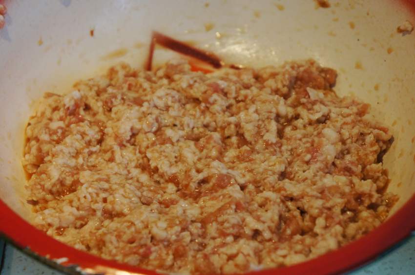 2、肉馅中分多次加入老汤沿一个方向搅拌均匀,让肉馅充分吸收老汤的汁液,再加入盐、油、葱、姜、五香粉、酱油、蘑菇粉、少许料酒拌匀;