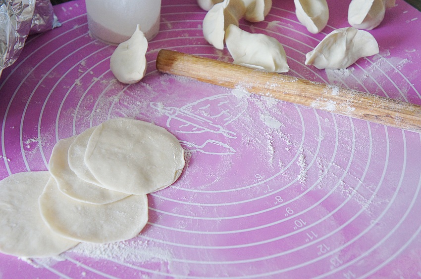 4、包饺子,将面团揉成长条揪成均匀的小面剂子,擀成饼,包上馅,两手对捏就好了,非常简单人人都会包;