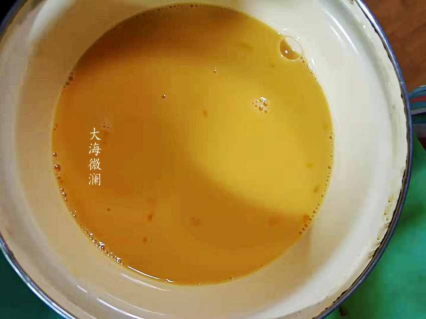 3、鸡蛋打散,搅拌均匀,把搅拌好的蛋液倒入牛奶中,充分搅拌,过三遍筛,让内馅更细腻;
