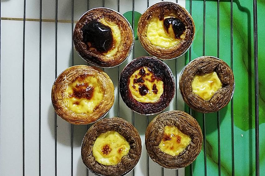 7、出炉,烤后色彩斑斓的蛋挞皮没有那么鲜艳了,不过颜色看上去还是有区别。