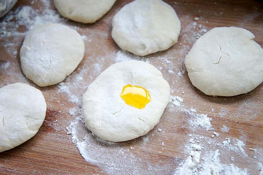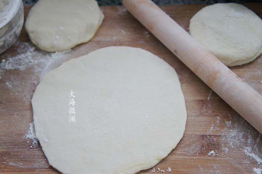 3、按扁,用擀面杖擀成大饼,尽量擀薄