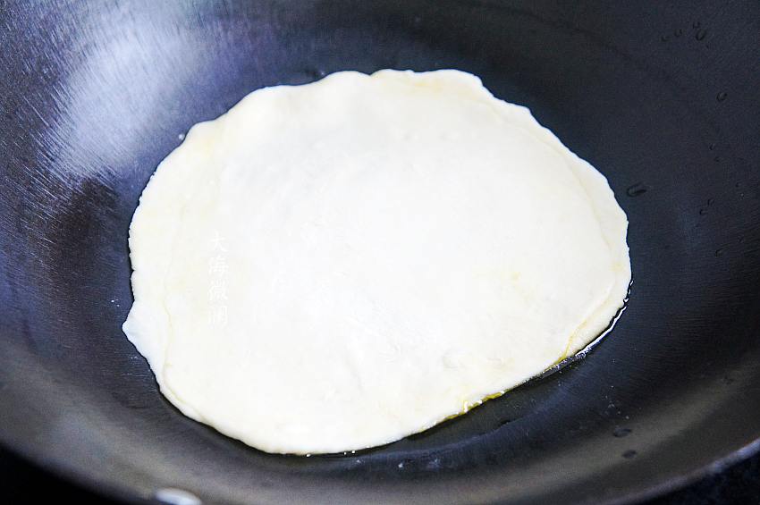 4、最好用平底锅,我这边没有平底锅,只好用大勺烙饼了。大勺锅底少许加点油,下入春饼;