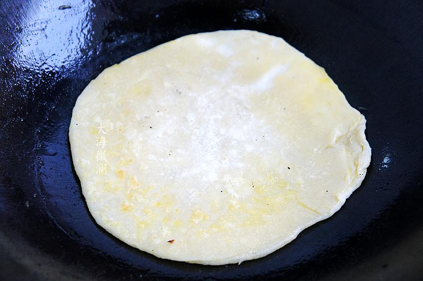 5、用铲子能推动春饼时,翻面烙,然后翻面摔一摔,既柔软又劲道;