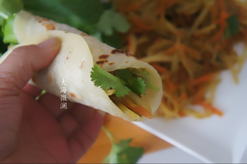8、这样子卷起来,非常爽口开胃的土豆丝卷饼就完成了;