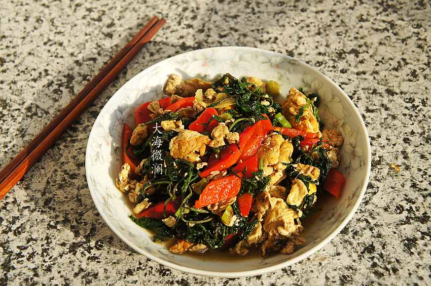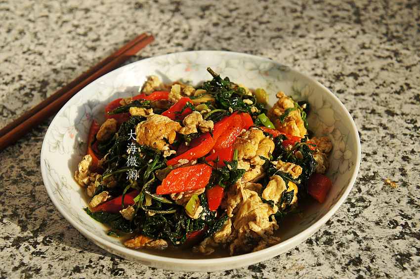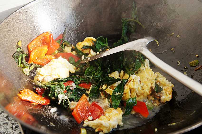 6、下入煎熟的鸡蛋和攥掉水分的鬼针草翻炒均匀;