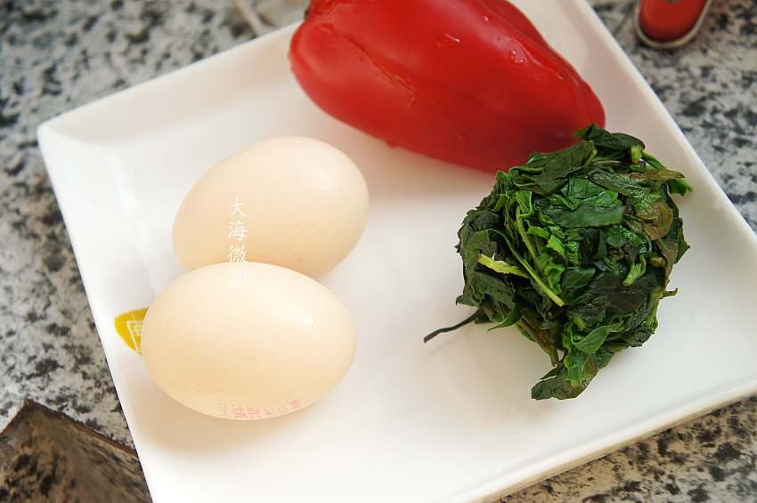 3、准备食材,红椒洗净切小块,焯水后的鬼针草叶攥掉水分备用;