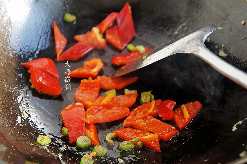 5、炒锅加入适量的油,爆香五香粉和葱花,加入红椒翻炒至红椒变软;