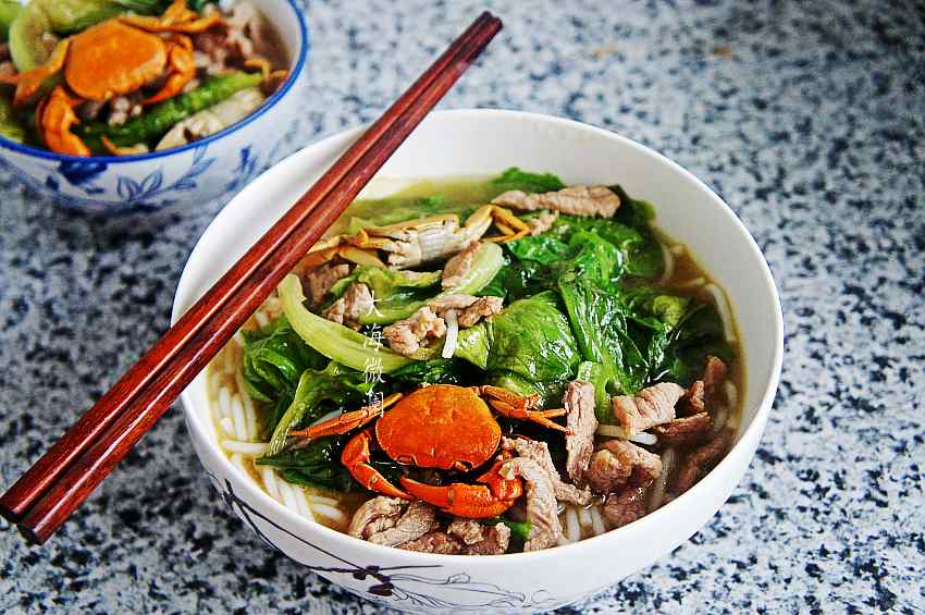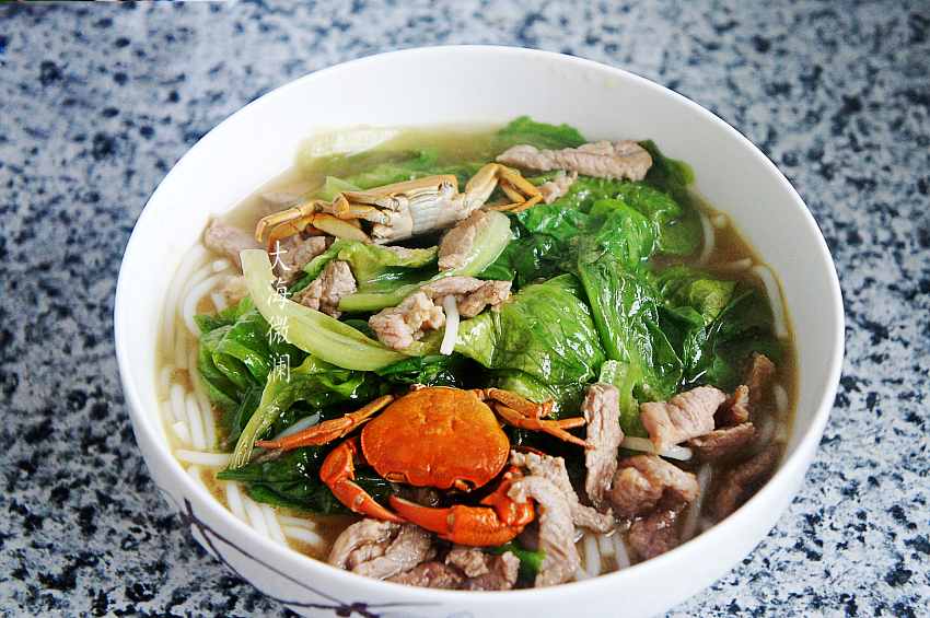 一月份在南方旅行,走了二十多天,在广西特别喜欢吃桂林米粉,在福建吃的米粉就不一样了,福建沿海,家家的米粉几乎离不开海鲜,虽然各家的做法大致相同,但是各种各样的海鲜却有不同,口感和味道当然也有差异,记得在湄洲岛景区的一家店,还专门和师傅学了米粉的制作,那一碗米粉当真是食材丰富,看着师傅一种又一种的海鲜食材往锅里扔,没吃就被鲜到了,同行的4人都超赞那碗米粉的鲜美,回来也想给哥哥做一碗这样的海鲜米粉,不过长寿村这边远离海边,海鲜很少,没有那么丰富,今天的煮米粉食材相对简单,猪肉加小河蟹和生菜,大概很久没吃的缘故,感觉这米粉还真鲜美,每人5只小河蟹,吃的还蛮有意思的,分享我们的煮米粉,欢迎大家点评。