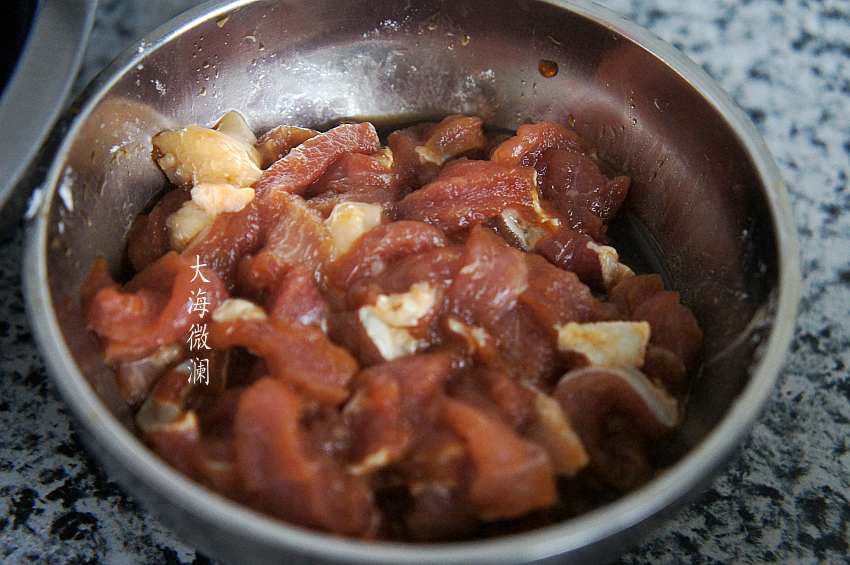3、猪肉洗净切条,加生抽、料酒和淀粉腌制10分钟;