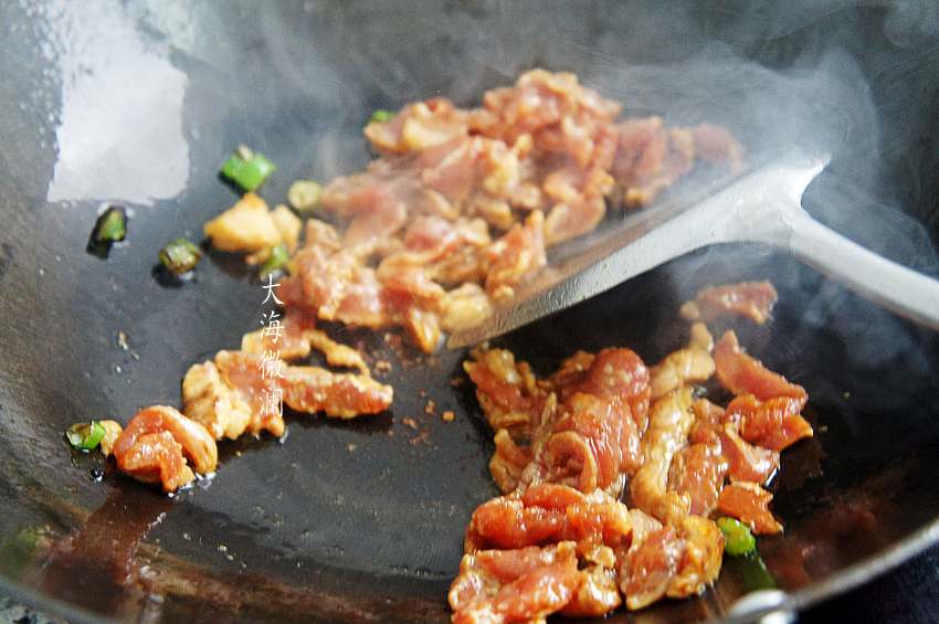 5、炒锅加入适量的油,爆香花椒粒,然后捞出花椒粒扔掉,爆香葱花,加入腌制好的肉条翻炒;