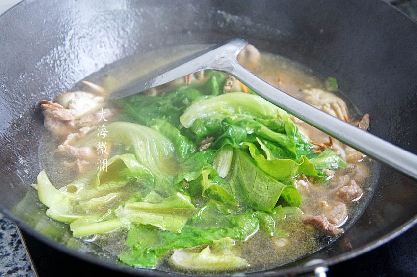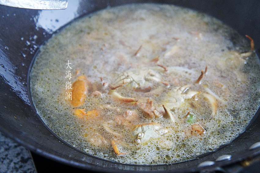 6、加少许老汤,老汤最好,没有老汤加常温水也可,下入小河蟹,大火烧开;