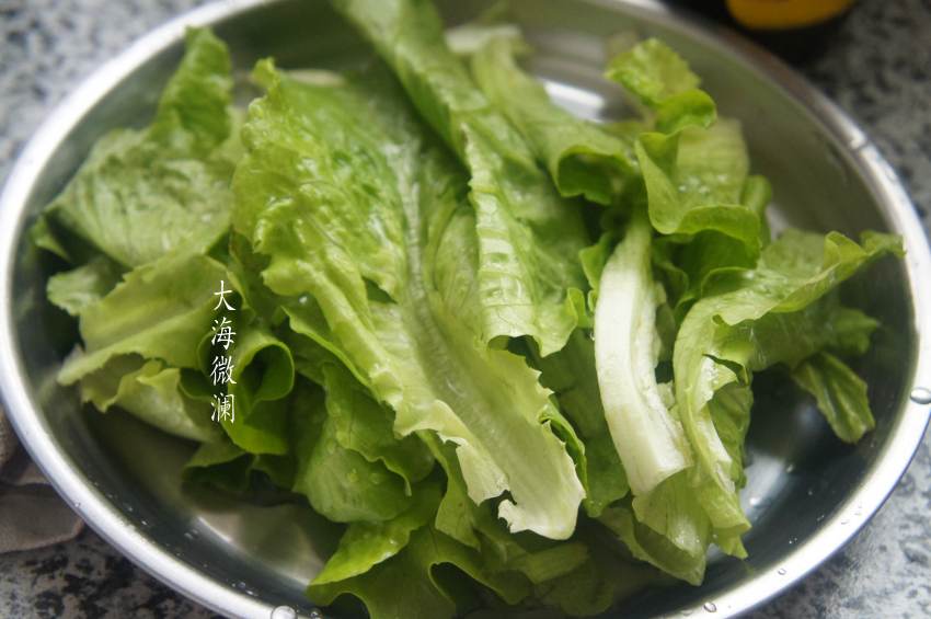 9、汤汁煮好,下入生菜叶,几秒钟后关火,加入盐、辣酱调味;