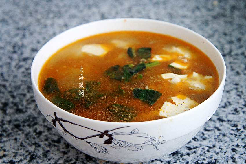 【盖菜豆腐汤】所需食材:水豆腐10小块;盖菜1小把;红椒丝少许;油适量;盐适量;五香粉适量;胡椒粉适量;葱花少许;生抽少许;香油少许。