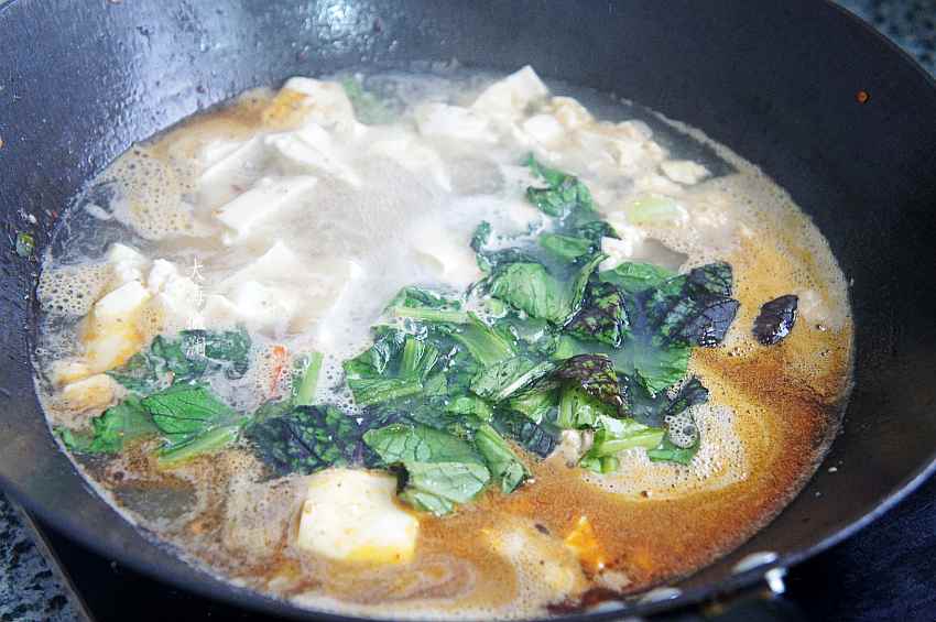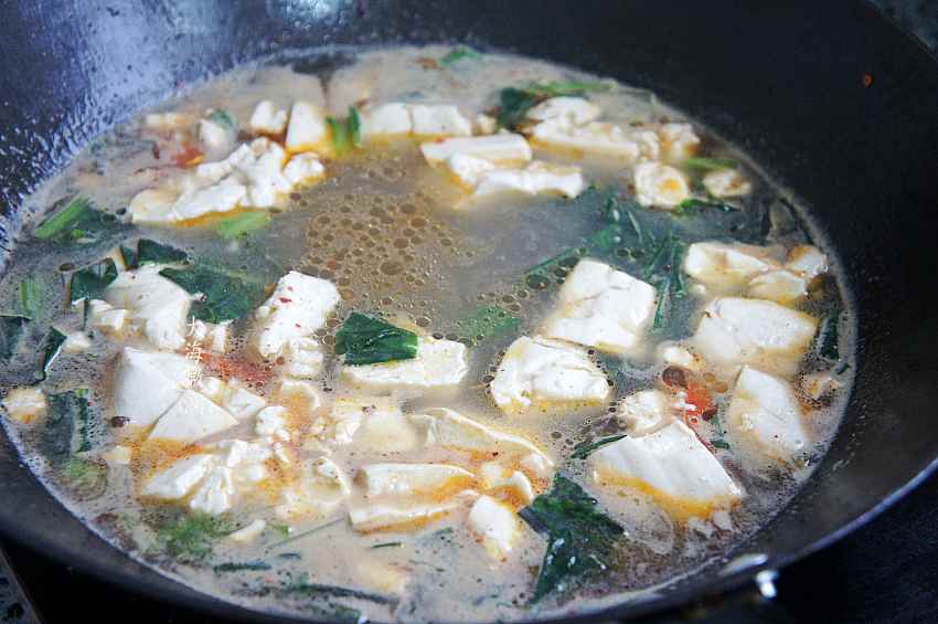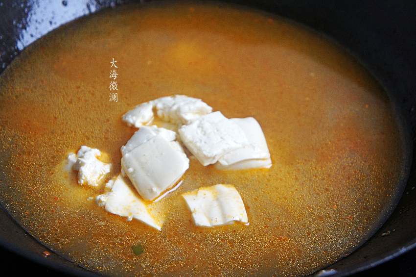 4、下入豆腐,大火烧开,小火炖10分钟左右,炖至豆腐都飘起来,所谓千炖豆腐,炖的时间越长越滑嫩可口;