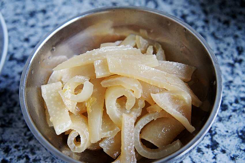 2、生猪肉皮清洗干净,锅中加入适量的水,放入猪肉皮烧开,待猪皮煮的变成透明色关火,捞出再仔细清理一下,将没有拔干净的猪毛拔净,然后把皮上粘的肥肉全部剔掉,收拾干净,再入锅煮熟,不要煮烂;
