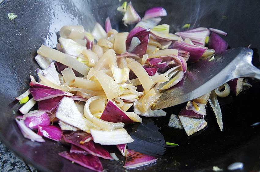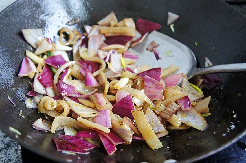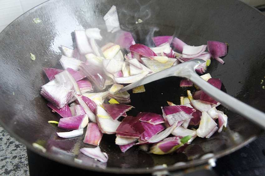3、炒锅加入适量的油,爆香五香粉,加入洋葱块翻炒;