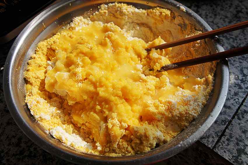 做法:1、将玉米面和白面各200g倒入盆中,加入白糖和适量的小苏达拌匀
