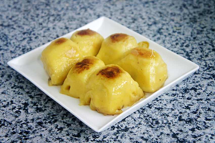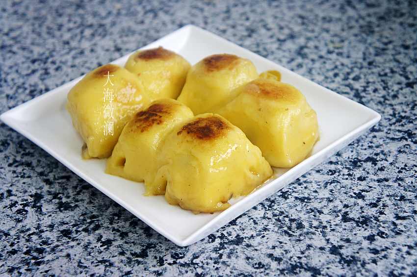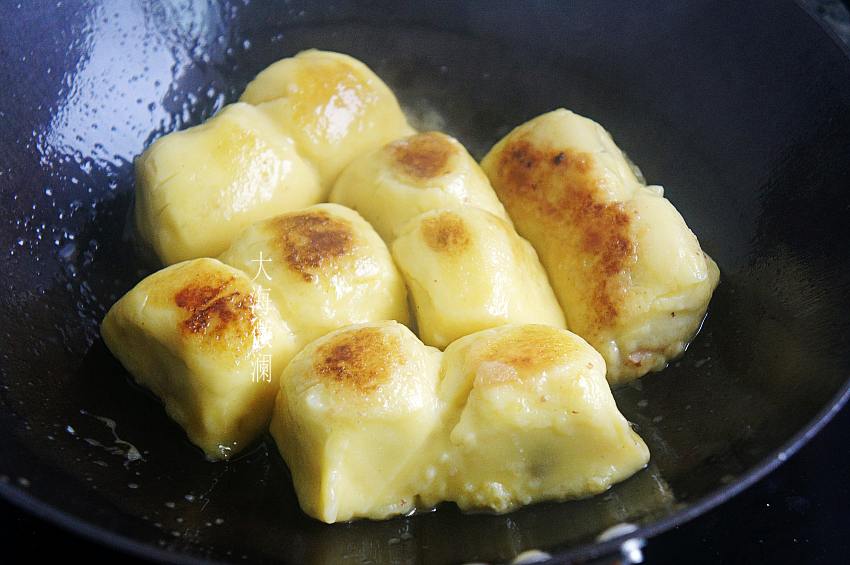 3、这是2人份的粘豆包,一面煎好后,翻面煎;