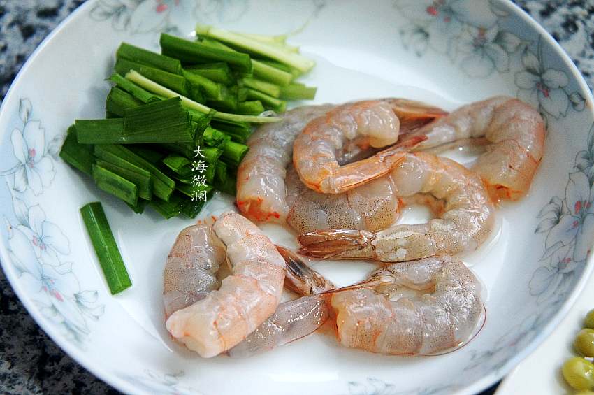【虾仁炒豌豆】所需食材:豌豆200g;大虾8只;韭菜少许;油适量;盐适量;料酒适量;蘑菇粉适量;