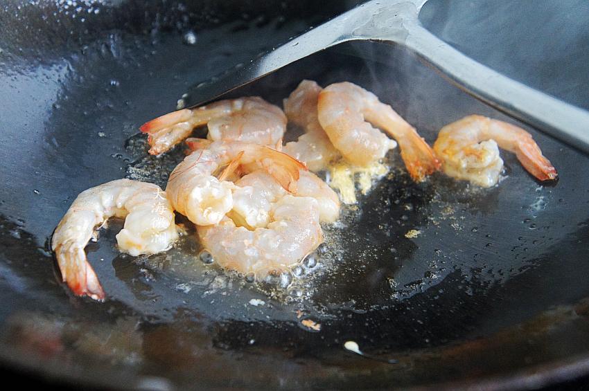 5、炒锅加入适量的油,下入虾仁翻炒;