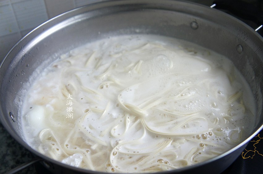 3、第二次水开下入面条,煮开浇上半碗冷水,再煮开;