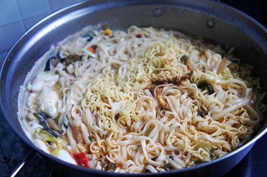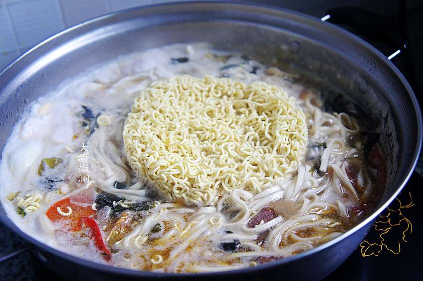 4、下入老坛酸菜的干料包,然后下入泡面,再煮开1分钟左右;