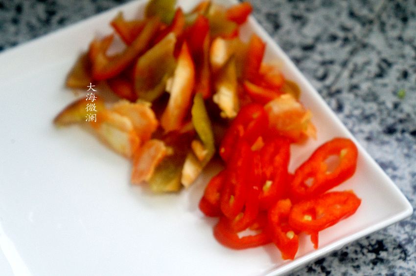 3、青椒和红椒洗净,青椒切块,红辣椒切圈;
