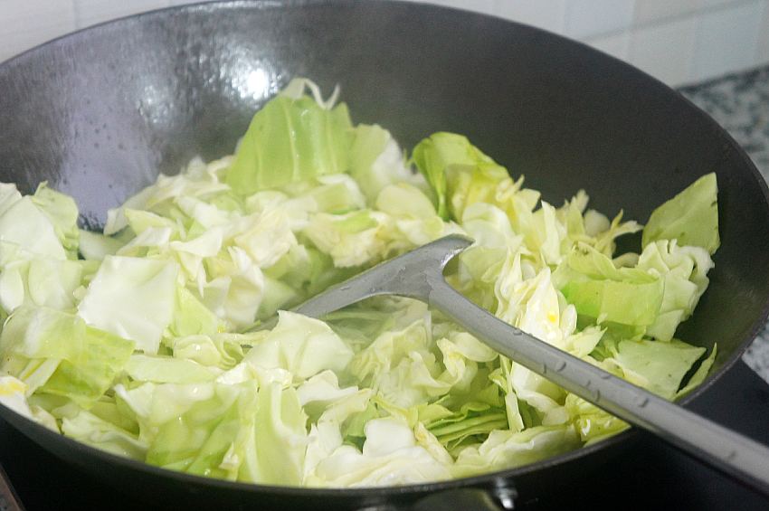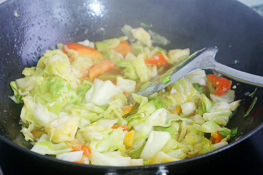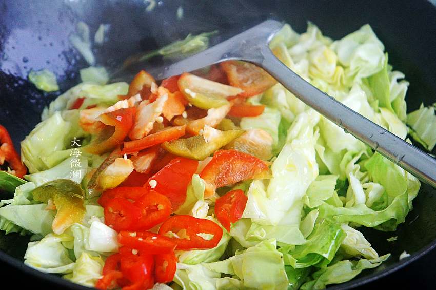 5、加入青红椒翻,少许加点水炒至甘蓝菜变软变绿;