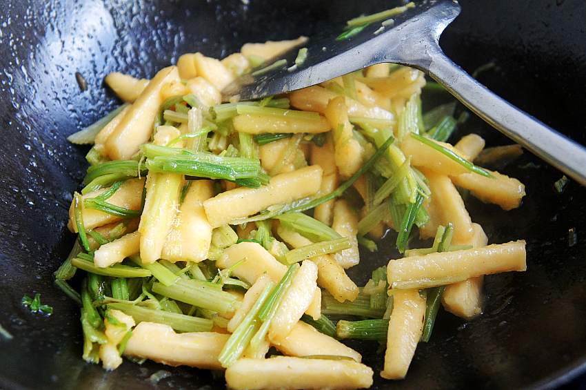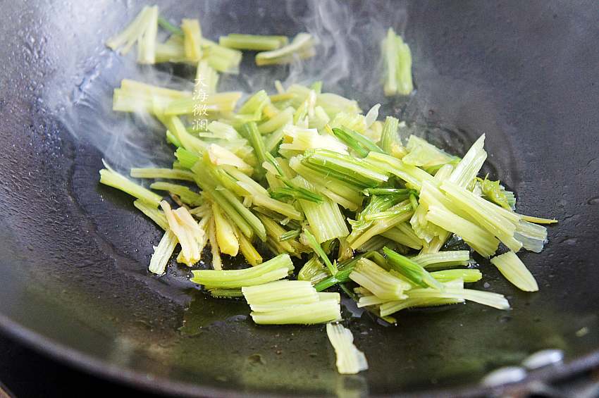 3、炒锅加入适量的油,爆香蒜末,加入芹菜翻炒;