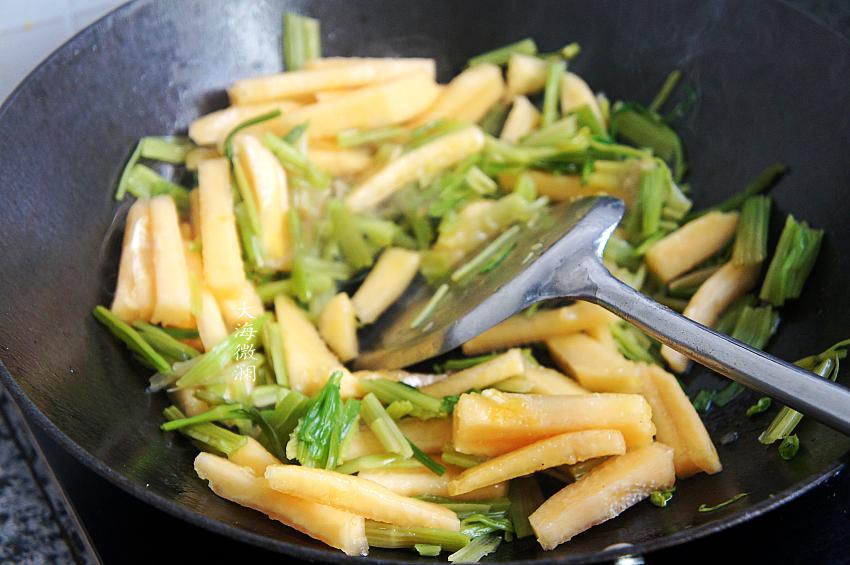 4、加入木瓜条翻炒,翻炒至木瓜条变软,出来汤汁为好;
