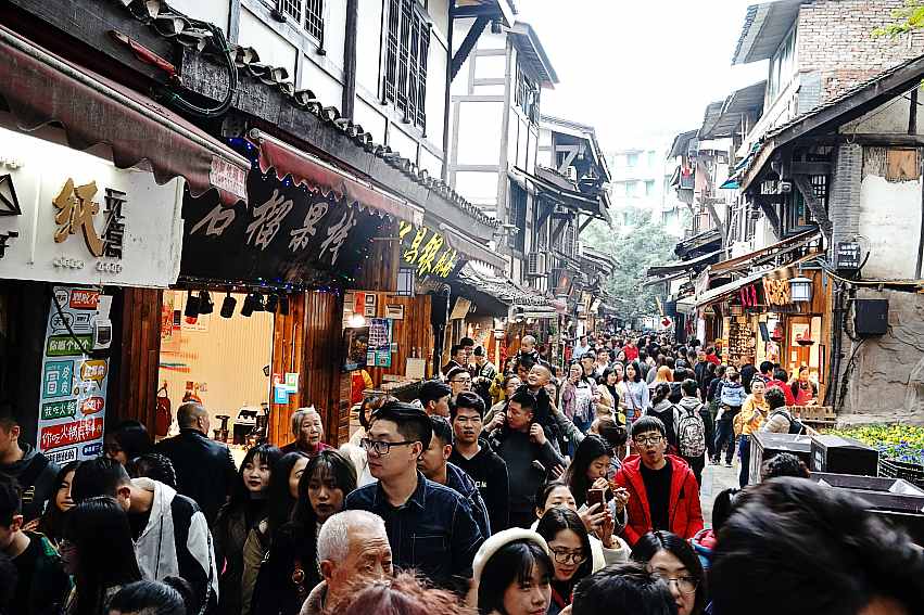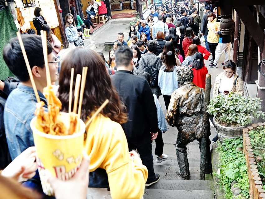 看看这满街的人,就知道这个古镇多有魅力,来了不吃小吃,岂不是白来了磁器口,今天我们整整吃了一条街,糍粑、臭豆腐、冰粉、锅贴等等,还有记不得的小吃,午饭都没吃,一路只顾吃了,加上满街的人,摩肩接踵,无法停下来也无法拍照,吃的开心就好。